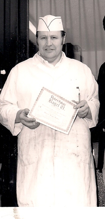 His uniform of whites – white trousers, tops and aprons – combined to make him look like a classic jolly baker. When remembered for heath and safety reasons he also wore a white hat. I usually saw him in whites and I always think of him wearing them. Whites always meant bakeries to me, whereas to most children they meant hospitals. They were like his second skin and it was disconcerting to see him out of them or in something outlandish like swimming trunks, shorts or even a tux for one of his National Association of Master Bakers Dinners.